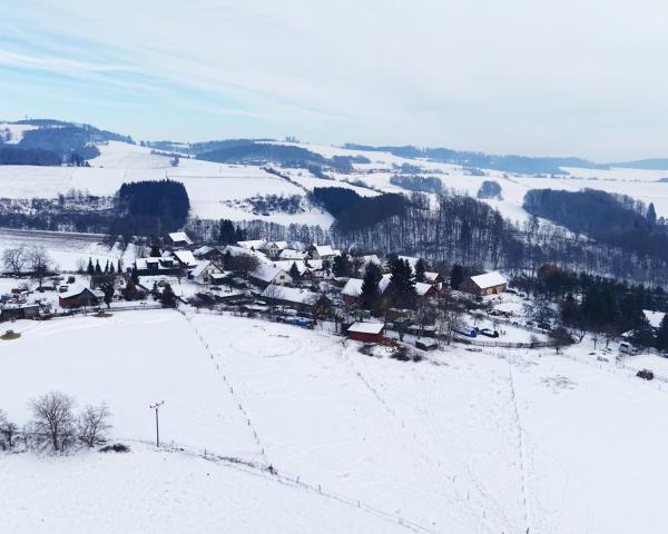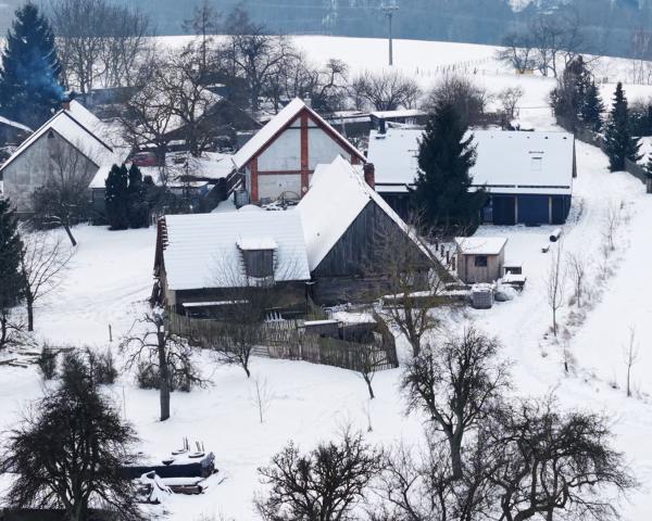Dům stojí v klidné části obklopené loukami a přírodou, ideální pro ty, kteří hledají poklidné bydlení mimo ruch měst, přitom s dobrou dostupností autem: